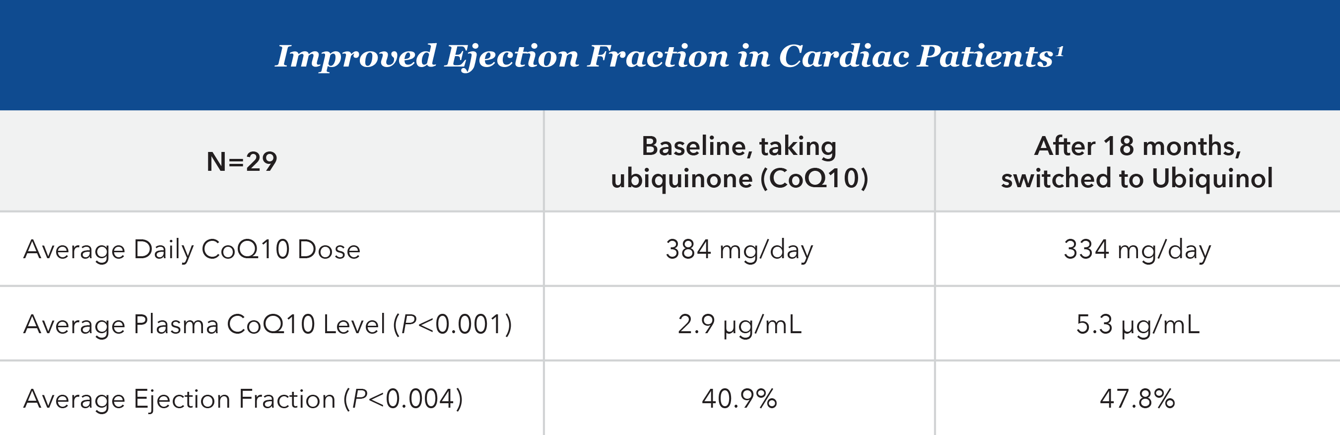 In case reports of 29 cardiac patients, those patients who switched to Ubiquinol (average of 334 mg/day) from CoQ10 (average 384 mg/day) for 18 months experienced an increase in average serum CoQ10 level from 2.9 µg/mL to 5.3 µg/mL (P<0.001)1