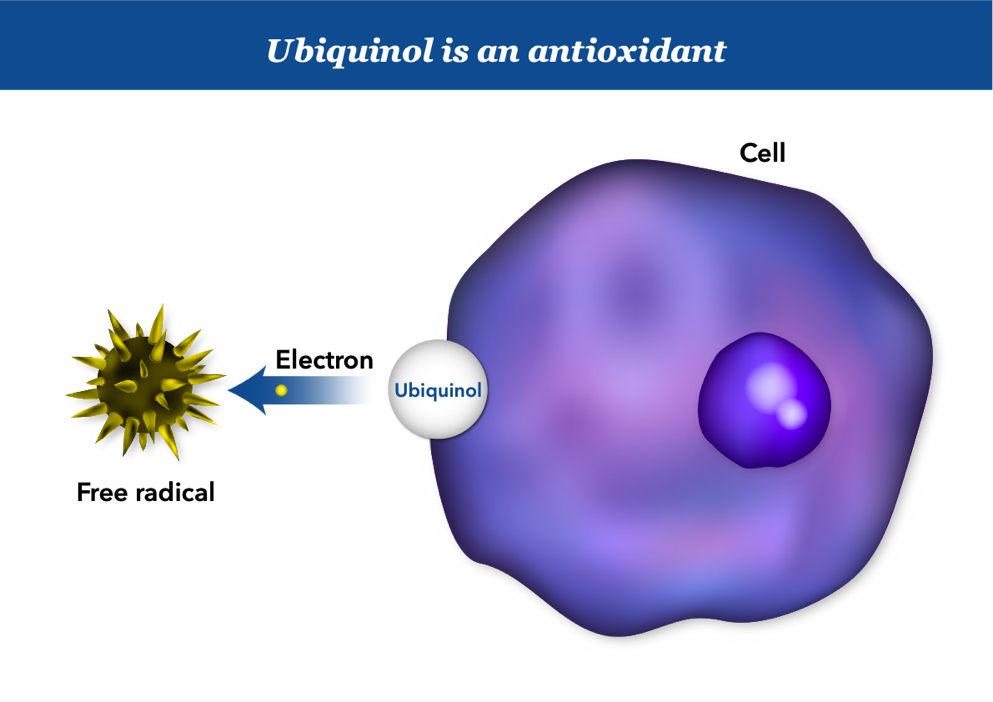 - Ubiquinol acts as an antioxidant and protects cells from the oxidative stress caused by free radicals, due to the extra electrons it carries5,6